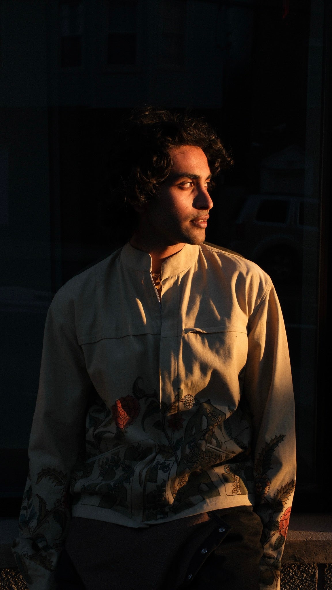 Release the flowers - Our kalamkari work jacket tells the story of a concrete jungle overrun with foliage. Starting with heavy weight cotton twill fabric for durability, we partnered with skilled kalamkari artisans from Andhra Pradesh to create compositions incorporating contemporary elements in the traditional hand-painted style. Features the iconic Tree of Life illustration on the back. Double zip closure and snap buttons on the cuff and collar.